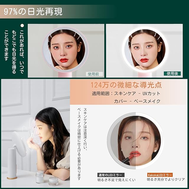 【83個のLEDライト】メイクミラーの明るさは自由に調整でき、最適な光環境でメイクができます。設定した明るさにはメモリ機能があり、毎回調整する必要はありません。ミラー表面のタッチキーを使用して、短押しで光色(日光色/昼白色/電球色)を切り替え、長押しで明るさを無段階に調整できます。