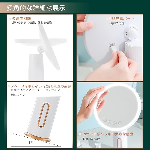 【360°自由回転】鏡全体が前後左右に回転し、メイクを異なる角度でチェックするのが便利です。これは単なるメイクミラーだけでなく、小さなナイトライトとしても使用でき、夜中ずっとあなたのそばにいます。円筒形のベースはデスクスペースを余分に取らず、他のアイテムを配置するスペースを確保できます。底面には3Mナノマジックテープがあり、しっかりと貼り付き、繰り返し使用できます。