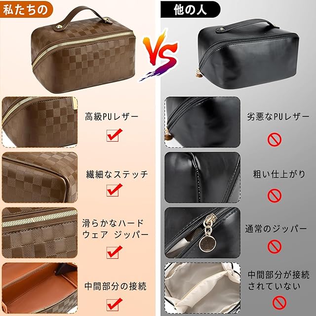 【高品質で耐久性のあるコスメバッグ】大型のコスメバッグは、高品質のPUレザー素材で作られており、柔らかく、厚く、耐久性があり、変形せず、お手入れが簡単で、内部の製品が湿気から保護される特別な防水表面を備えています。メイクアップバッグの高級PUレザーのアップグレードにより、ウォッシュバッグの形状がより立体的になりました。当社の旅行用メイクアップバッグには、開閉に便利な高品質の金属ジッパーが付いています。