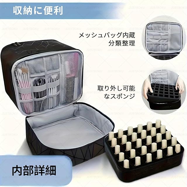 ネイル収納ボックスには、多くのポケットやネットポーチが付属しており、化粧品やアクセサリーを整理するのに非常に便利です。内部の仕切り板は自由に調整でき、ネイル道具、化粧品やスキンケア製品を簡単に整理できます。また、取り外し可能なスポンジグリッドが付属しており、ネイルカラーや精油を収納するのに最適です。