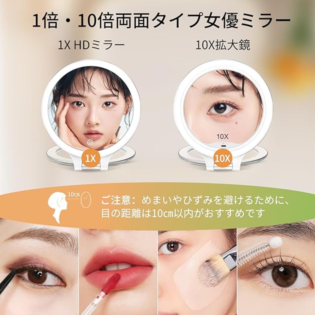 LED ライト付き 女優ミラー 卓上 メイクミラー 充電式 1500mAh内蔵バッテリー 3光色 明るさ無段階調光 320°角度調整 10倍拡大鏡付き 折り畳み式 壁掛け式 持ち運び便利 円形 ホワイト | ascend
