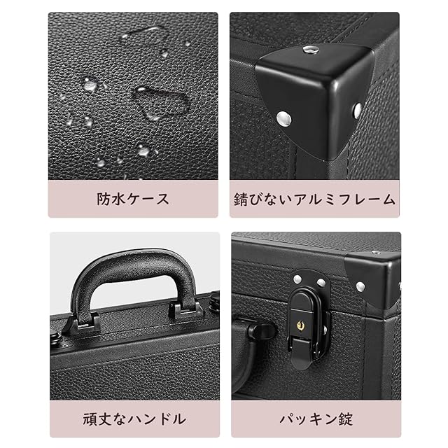 「上質な素材採用」 ボックスは全体はハードなアルミ合金素材で作り上げられ、外部からの衝撃を緩和できます。更に耐久性に優れた厚めのPUレザーを表面に加え、綺麗な光沢感を持ち、汚れや不意による噴水などから化粧道具を守ります。