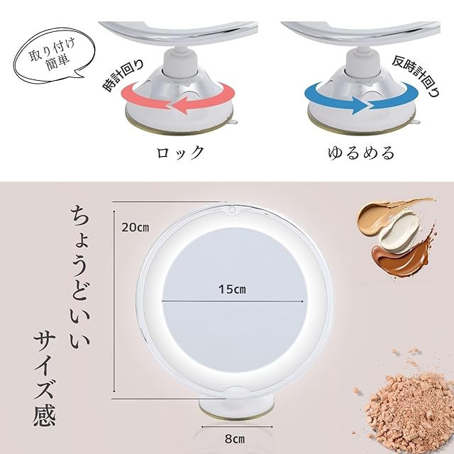 【360度回転】好きな角度に調整可能です。高さや角度を調整することでメイクしやすく時間短縮にも。【設置方法】1:吸盤を反時計回りにまわし、ロックを解除します。2:吸盤をなめらかな平面に押すように貼り付けます。3:吸盤を時計回りにまわしミラーを固定します。4:しっかり設置できているか確認すれば完了です!