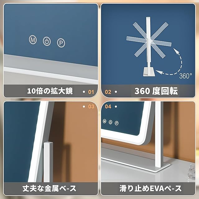 【10倍拡大鏡&360度回転可能】吸盤式10倍拡大鏡が付き、毛穴の状態やアイラインのズレもチェックでき、肌の細やかい状況とスキンケアをしっかり把握します。卓上ミラーは錆びにくい金属フレームと華やかなの光学ガラスをを採用しています。また、ハリウッドミラーが360度回転し角度調整が簡単で、自分の顔を動かしたりする必要がないのもポイントです。さらに、卓上ミラーは重みと安定感のあるスタンドを使って倒れなくて、安定します。