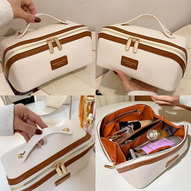 Aylashine 韓国のポータブル化粧ポーチ 携帯用メイクポーチ 大容量 女性用 PU レザー メイクアップ 女の子用旅行用トイレタリーバッグ 大きな開口部を備えたダブルメタルジッパー ハンドル付き仕切り付き (ブラック) | ascend