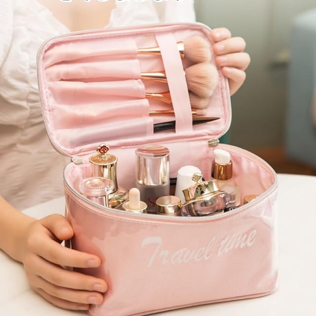 大容量の収納:この化粧バッグは、様々な化粧品や美容ツールを収納するのに十分な容量を備えています。ファンデーション、口紅、アイシャドウパレット、ブラシなど、整理整頓された状態で化粧品を保管するための複数の仕切りがあります。