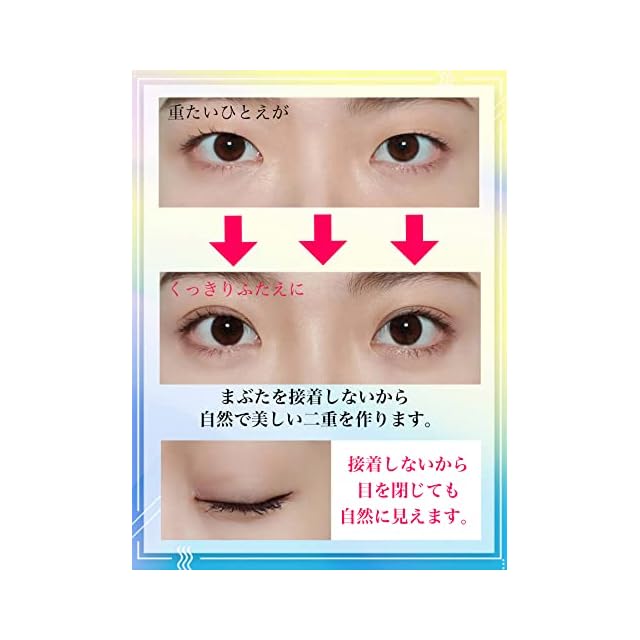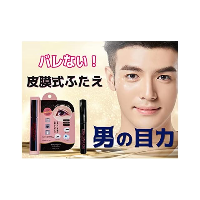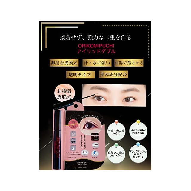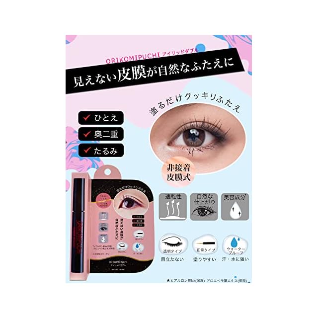 まぶたをくっつけない折り込み式の二重まぶた化粧品になります。皮膜式とも呼ばれていて目を瞑ったときにも不自然になりにくいことが魅力。アイメイクをするとよりいっそう目立ちにくくなり、自分の目の形にあわせて塗る場所も調整しやすいので、初心者の方やふたえにしたい男性にもおすすめです。ゴムラテックスを使用しておりますのでゴムラテックスにアレルギーのある方はご使用をお控えください。