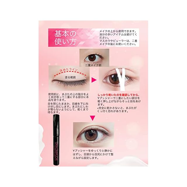 おすすめの使い方、アイメイクをした後(ラメ入りアイシャドウがお勧め)ふたえにしたい部分の下側にオリコミプチアイリッドダブルを塗り完全に乾かしてからプッシャーで押し上げながらそっと目を開きます。テカリが目立たないよう作っておりますが、テカリが気になる場合は綿棒で優しくなぞってからプッシャーで押し上げるとテカリを抑えてくれます。 まぶたのたるみが気になる方は、アイメイクをした後(ラメ入りアイシャドウがお勧め)まぶたを指で真上にひっぱりふたえのラインの上にオリコミプチアイリッドダブルを塗りそこが乾いたらさらに1〜2mm上まで塗り完全に乾かした後プッシャーで押し上げてください。 どちらも、完全に乾かしてからもう一度同じ所を塗って乾かしてからプッシャーであげると、人工皮膜が強化され落ちにくくしっかりしたふたえになるので試してみてください。