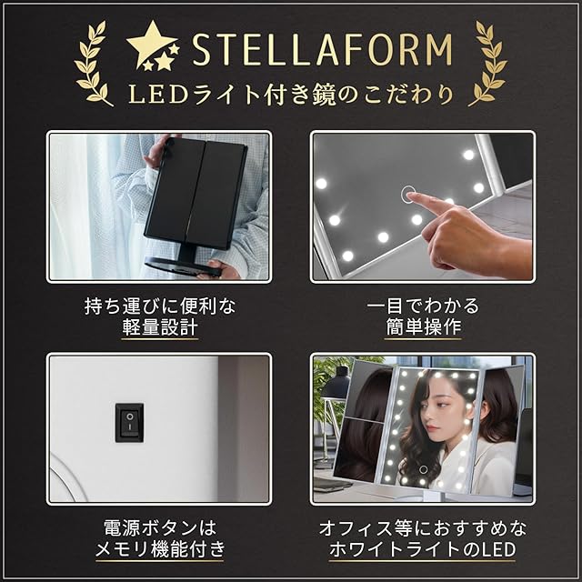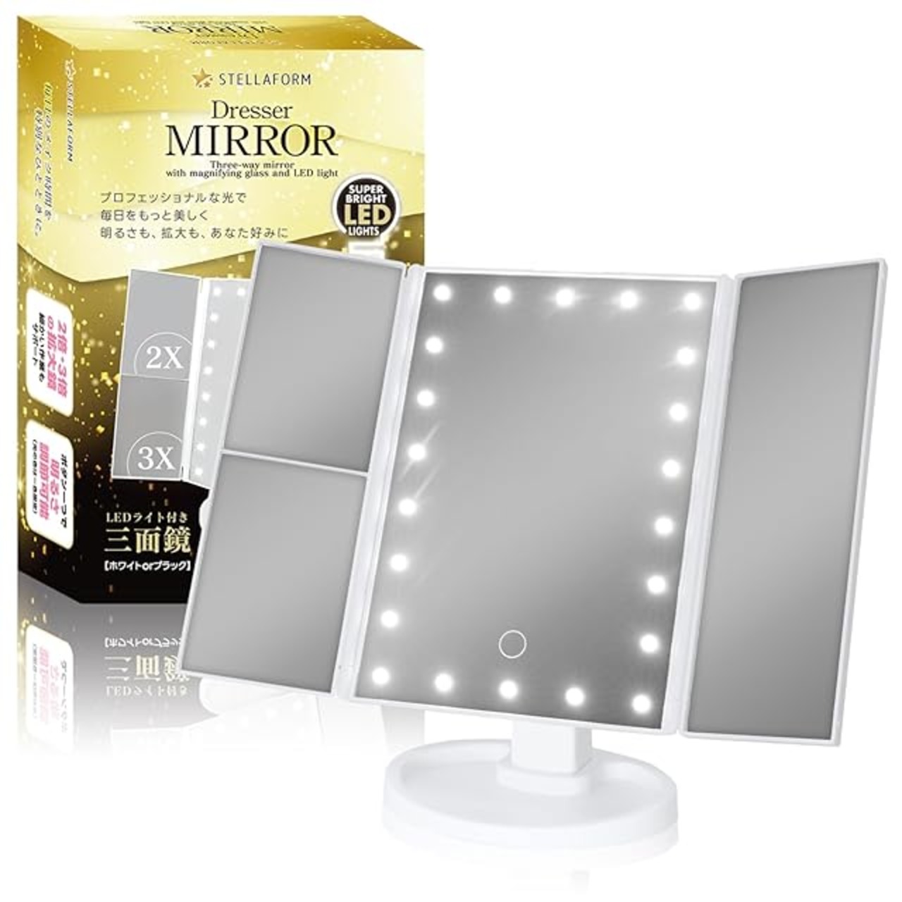 【自然な明るさ仕上がりキレイ】 STELLAFORM 女優ミラー LEDライト付き 三面鏡 卓上 メイク 鏡 ワンタッチ式 『上下左右180°ミラー角度調整で、抜かりのないメイク仕上げ』 拡大鏡 2/3倍 ホワイト