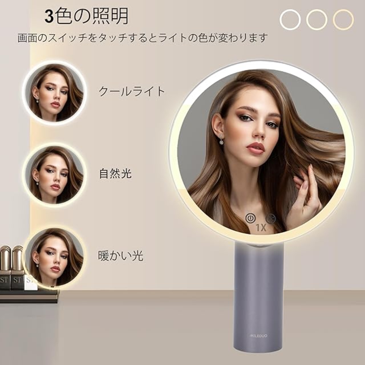 【3パターン調色&調光機能&明るさメモリー機能】スキンケアで重宝する昼光色、普段使いしやすい昼白色、夜に便利な電球色の3色調光が可能。簡単に操作できるタッチパネルが搭載されているので、タッチスイッチに触れただけで昼光色・電球色・昼白色の三色照明モードに切り替え可能。オフィスや職場など蛍光灯の下、日中の外出の太陽光の下、レストランや夜間の外出など暖色照明の下など様々なシーンでメイクチェックが出来る。タッチスイッチを長押しすることで明るさを無段階調光することができる卓上ミラー。周囲の明るさや場所に合わせて明るさを細かく調節できる。前回使用した照明設定が自動で再開されるメモリー機能が付いている。天候や照明の影響を受けずに、毎日美しいメイクをお楽しみいただけます。