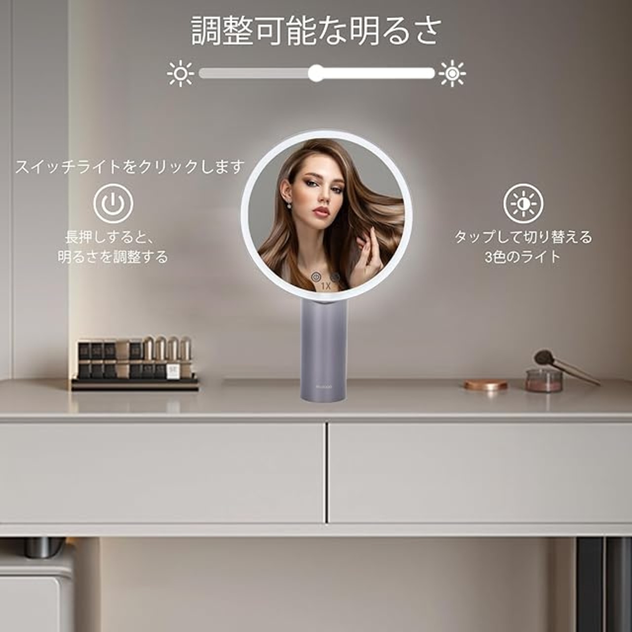 女優ミラー 22.5CM LEDミラー Pure-Luxリング導光技術 3色モード 化粧鏡化粧ミラー 卓上ミラー メイクミラー 回転可能 タッチ式 USB充電 磁気10倍拡大鏡付き <p>タッチ式</p> <p>タッチ式ボタンで操作便利です。</p> <p>充電するには、付属のType-C USB充電ケーブルをお客様ご用意の充電器(入力5Ⅴ/2A)やUSB口付きのコンセント(入力5Ⅴ/2A)に差し込んで充電する必要があります。</p> <p>磁気式拡大鏡(10倍)を本体の鏡面の真ん中だけに取り付けることができます。拡大鏡は眉、毛穴など細かなところのお手入れに適しています。ミラー本体の鏡面の真ん中に拡大鏡を取り付けてください。</p> <p></p> <p>回転可能</p> <p>鏡面が45度調整可能です。</p> <p></p> <p>2000mAhバッテリー内蔵され、一度の充電で一週間もちます。</p> <p></p> <p>ご注意:充電は5V/2Aアダプターでお願いいたします。</p> <p></p> <p>吸盤設計</p> <p>特殊なシリコン吸盤設計の底面は、卓上等に吸着して倒れません。</p> <p></p> <p>ご注意:ミラーは壊れやすいものですので、衝突や落下を避けてください。ミラーが割れて、ぽろり可能性があります。</p>