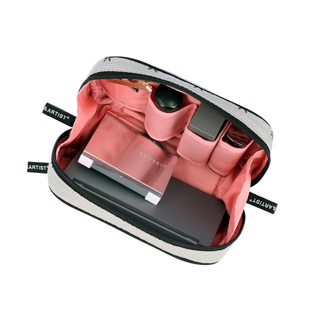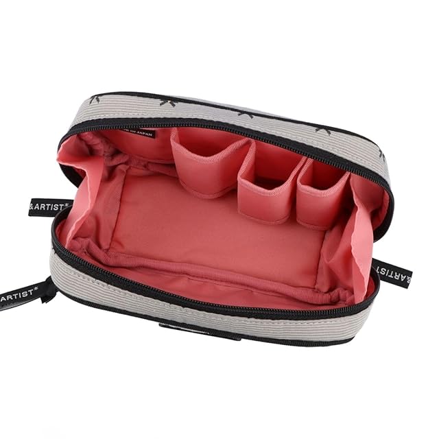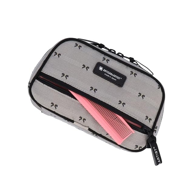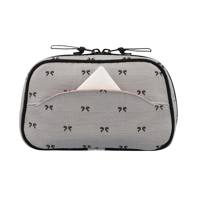 立体感のあるグレーのベース生地に、繊細なリボン模様が散りばめられた上品なデザインのポーチ。内側は優しいミスティピンクで、落ち着いた雰囲気を演出します。 ホリデーシーズンに最適なこのポーチは、大切な方への贈り物や自分へのご褒美にもぴったり。シックで華やかな印象を与え、特別なひとときを彩るアイテムです。 笹マチ付きのメインファスナーを底まで開けると、中身が一目で確認できます。身の回りの細かいアイテムがすっきり収まるので、お出かけ時に大活躍のティッシュケース付きポーチです。 大きめのリップホルダーが付いているので、コンパクト系のアイテムと厚みのあるリップスティックがスッキリと収まります。メイクポーチとしてはもちろん、身の回りの細かなアイテムを整理する、マルチポーチとしても活用できます。