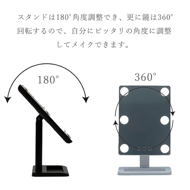 【360度垂直回転式】スタンドは180度で角度を調整でき、鏡は360度回転するので、自分にピッタリの角度に調整してメイクできます。ニーズに応じて、完璧で快適な視野角を確保できます。
