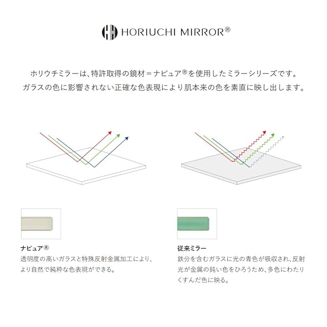 【正しい肌色を映し出す特許のミラー】HORIUCHI MIRRORが開発したナピュアミラーは、くすみの原因となる鉄分をより多く取り除いた透明度の高いガラスと、色の再現性が高い反射金属との組み合わせにより、本来の姿をありのままに映し出す特許を取得したミラーです。(特許番号:PAT3732490) 肌の色が鮮明に映ることで、自分に合ったファンデーションの色味がわかり、メイクの仕上がりが格段よくなるため、美容業界のプロの方々にも支持されています。また有害な鉛成分を全く含まない、人と環境にやさしいミラーです。