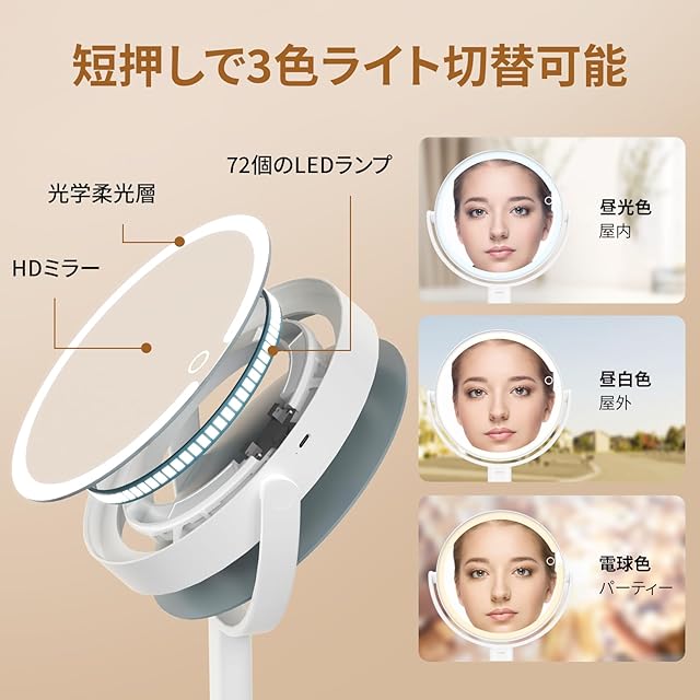 【3色のライトと無段階調整】拡大鏡は昼光色・昼白色・電球色の3種類のライトモードを搭載。ボタンを短く押すとライトのオン/オフやモード切り替えができ、長押しで滑らかな無段階調光が可能です。72個のLEDライトで光の強さを自由に調整できるため、自分に最適な光環境でメイクを楽しめます。天候や照明の影響を受けず、メイクの仕上がりが一定に保たれます。