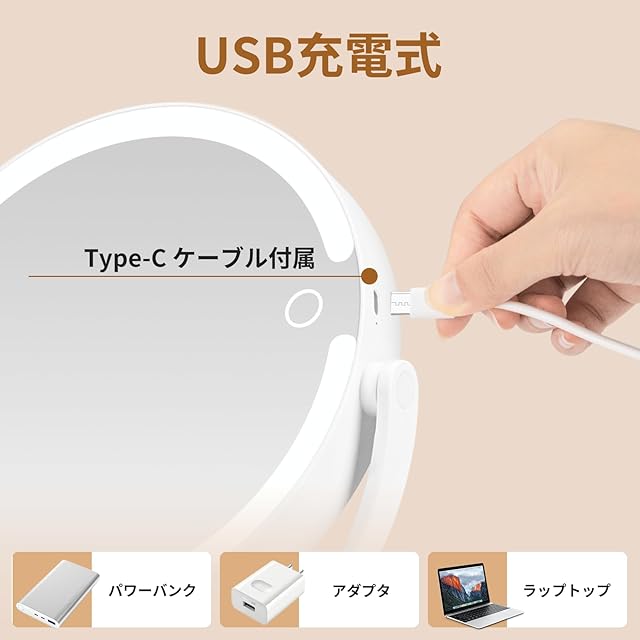 【USB充電式】両面化粧鏡はType-C充電式で、大容量2000mAhのバッテリーを搭載しています。わずか2~3時間の充電で、日常使用の場合、最大8日間持続します。付属のUSBケーブルを使用して、パソコンやモバイルバッテリー、アダプターに接続可能です。電池が不要で、コストパフォーマンスに優れています。