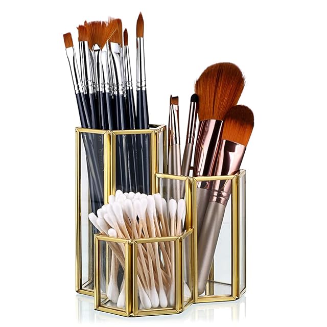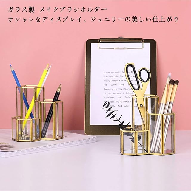 【透明な立体空間】透明なガラスと頑丈な金属フレームで作成された幾何学的化粧ブラシホルダー!