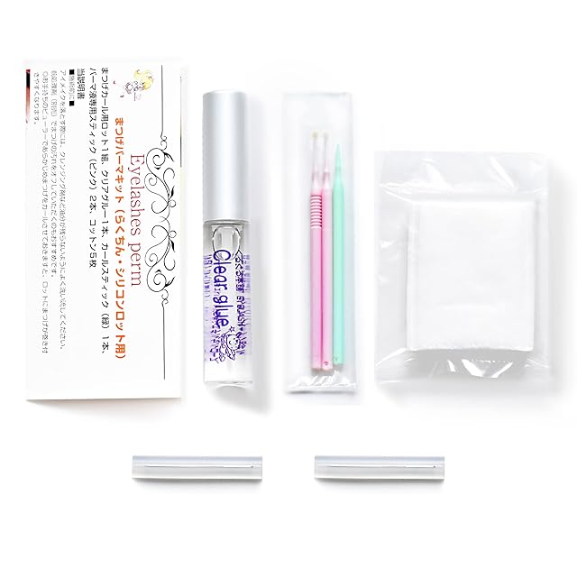 【セット内容】 まつげパーマ用グルー×1、カールクリーム用スティック×2、カールスティック×1、ワイヤ入りシリコンロット×2、オーガニックコットン×5、説明書×1。