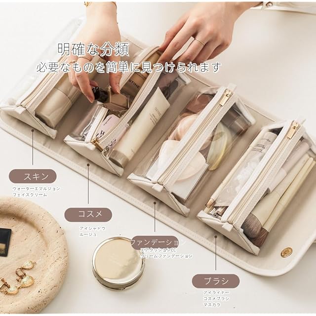「超絶メイクポーチ、精巧多機能・どこでもビューティーキット」 — 進化版4in1化粧ポーチ ひと目で見える、時間を節約【4つの仕切り】 探し回さず、即座に見つけ出せる!この化粧ポーチは4つの独立なセクションを備え、あらゆる化粧品に適した「家」を提供します。分類管理を簡単に実現し、化粧の流れをスムーズに進め、効率を倍増させます。