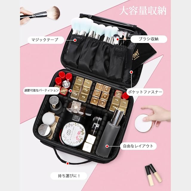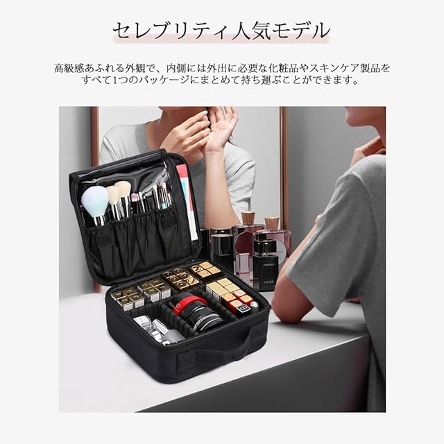 使いやすいデザイン性: 6つの調整可能なEVAパーティションで、収納部分をお好きなサイズで区切る事ができます。すべての化粧品、メイク道具、ジュエリーを分離して整理できます。メイクブラシホルダーにはプラスチックのカバーが付いているので、ブラシに残った粉がカバン内に移ることはありません。