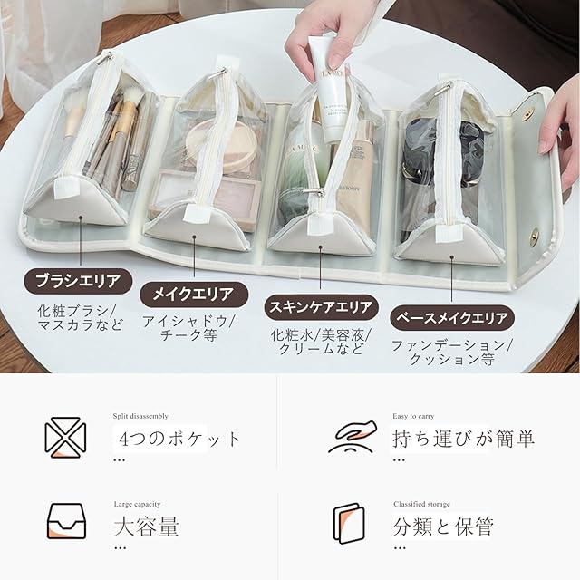 ✅【分類・分割収納】この化粧品バッグには透明な収納ポケットが4つ内蔵されており、美容用品をさまざまなカテゴリーに分けて収納できます。各ポケットが一目でわかるので、探さなくても必要なものが一目で見つかります。メイクブラシ、マスカラ、アイシャドウ、チークなど、それぞれに専用の場所があり、アクセスしやすいです。