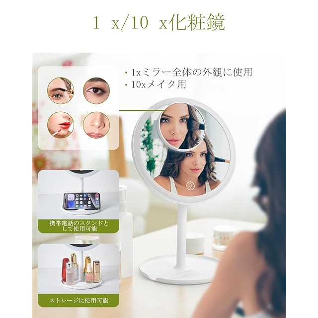 【製品リスト】1 x/10 x化粧鏡*1、C型データ線*1、クリーニング布*1。光が不足している場合でも、コンタクトレンズを装着したり、メイクをしたりすることができる優れた化粧専用LEDミラーです。