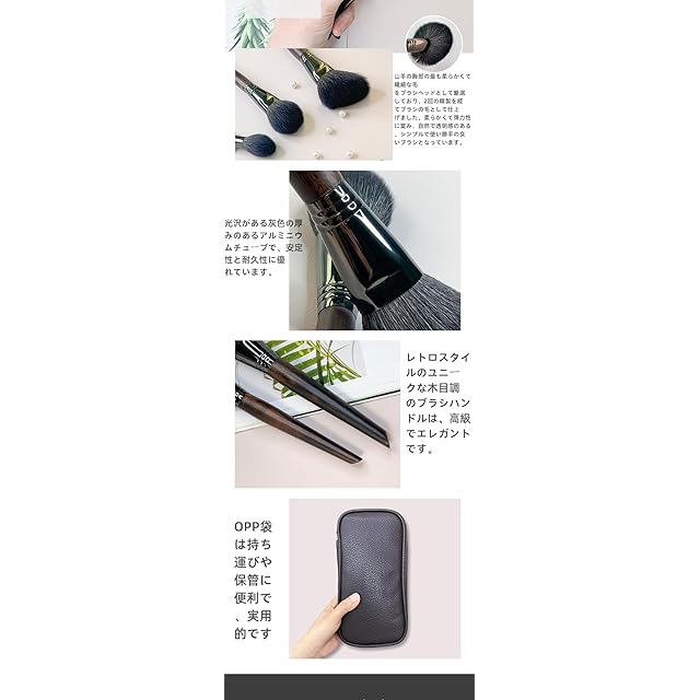 繊細な光沢のある羊毛を使用しており、毛先はふわふわで柔らかく弾力性があり、メイクが均一にのりやすく、長持ちします。ルースパウダーブラシ:毛が最も多く、毛の層がはっきりしているブラシです。ブラシの下部は毛の密度が高く、上部は密度が低い構造になっており、ソフトで顔への刺激が少なく、弾力性に富んでいます。コントゥアリングブラシ:顔の輪郭やあごにフィットするように角度をつけたブラシで、適量のコントゥアリングパウダーを取り、顔の上部から下部へ向かってパウダーをやさしくなじませるようにお使いください。 チークブラシ:ろうそく型のチークブラシで、力を入れなくても、チークの位置を正確にコントロールでき、境界線を感じさせずにぼかすことができます。 ファンデーションブラシ:丸平型のブラシで、リキッドファンデーションが伸ばしやすく、厚塗り感を防ぐことができます。ベースメイクが肌にしっかりと密着するため、軽やかで自然な仕上がりを実現します。 ろうそく型ブレンディングブラシ:ふわふわで柔らかい毛を備えた小さなろうそく型のブレンディングブラシは、アイシャドウを自然かつ均一にぼかし、ベースメイクとブレンディングを素早く完成させることができます。アイシャドウブラシ:アイシャドウブラシの中でも必須のブラシタイプで、アイシャドウのメインカラーをのせたり、目尻を濃くしたりすることができ、目元を立体的に見せ、より自然に仕上げることができます。丸型ディテールブラシ:小さな尖ったデザインで、目尻の隙間を埋めたり、涙袋に色をのせたり、目頭にハイライトをのせたりする際にお使いいただけます。コンシーラーブラシ:顔のシミやニキビ跡などの気になる部分をカバーする際に使用するブラシです。先端が平らになっているので、細かい部分もしっかりとカバーすることができます。リップブラシ:細くて短い平型ブラシで、クリーム状の製品を軽く取り、唇の輪郭や形を正確に描き出すことができます。また、目の下のしわやほうれい線をカバーするのにも最適です。アイブロウブラシ:アイブロウブラシの毛はある程度の硬さと弾力があります。非常に細い平型ブラシなので、眉毛を素早く正確に描くことができます。