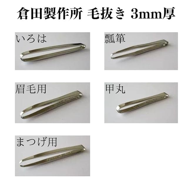 熟練の毛抜き職人 倉田さんが手打ちで丁寧に作った毛抜きです。光にあててすかして見たときに、光が通らないほど刃先がピッタリと合っているので、1000分の5ミリのうぶ毛さえ、しっかりと掴んで軽く抜きとります。平仮名の「い」に似ている事から付けられた名前で、伝統的な形です。頑固な髭や腋毛にも対応し、様々な使用目的で使えるオールマィティーな毛抜きです。3mm厚の素材を使ったタイプでしっかり握り応えがあります。