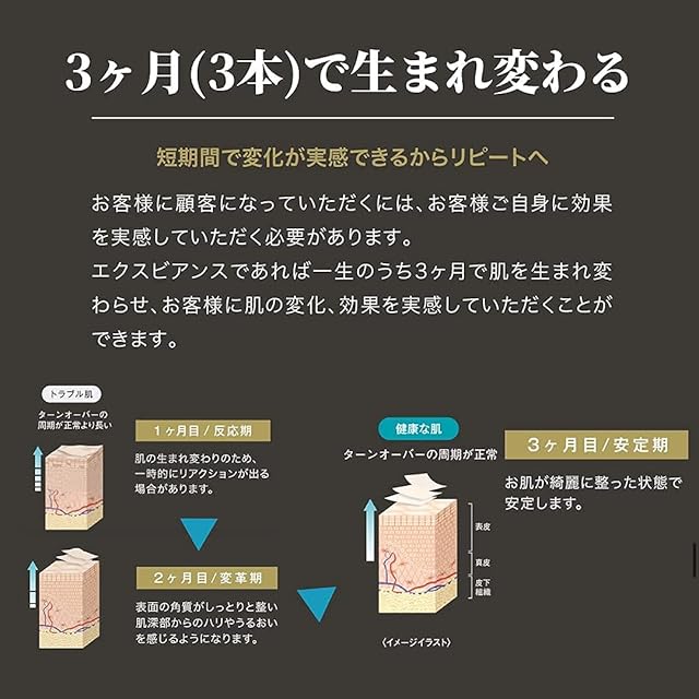 【エクスビアンスとは・・・】AHAテクノロジーを発見した2人の医学博士によって設立された、世界的な皮膚科学研究機関「Neo Strata社」が開発したスキンケア化粧品です。数多くの科学的・臨床的研究から得たエビデンスにより、多くの新しい特許成分と“結果”の出る化粧品を開発し続けており、エクスビアンスには古い不要な角質を除去してターンオーバーの正常化をサポートする成分として知られるAHAや、AHAと同様の効果を持ちながら、肌に対してマイルドなPHAを配合されています。