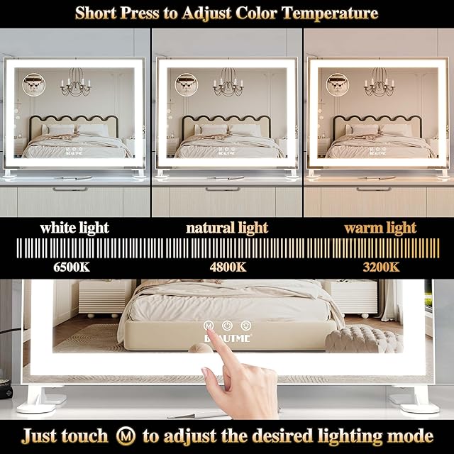 【タッチセンサーコントロール & メモリー機能】大きなライトアップミラーには日本標準プラグが付いており、3つのスマートタッチスクリーンボタンがあり、ライトの色と明るさをコントロールします。 ライトをつけると、メモリー機能が前回と同じ設定を維持します。