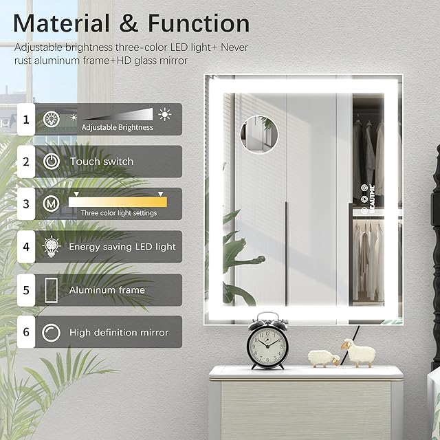 【安定したベース&フレーム】メイクアップミラーは12V-2A電源を使用し、電池を必要としません。 アルミ合金製のベースブラケットと金属フレームは高品質で耐久性があり、場所を取りません。