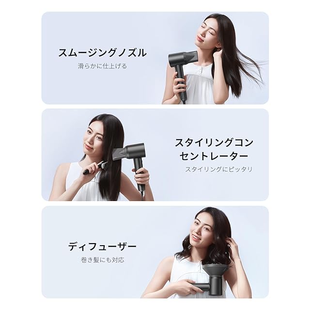 【スマートな温度制御、熱のダメージから守る】Laifen独自の温度制御技術、内蔵のマイクロプロセッサー・スマートチップにより、発熱線の出力をリアルタイムで自動制御することで風口温度を均一に保ちます。100回/秒の定温アルゴリズムにより、風口の温度変化を精密に検知。過熱を自動的に補償することで、温度を微調整し、高温による髪のダメージを防ぎます。*Laifen Swift Specialヘアドライヤーには、Swiftヘアドライヤー1台とスムージングノズル1個に加えてディフューザー1個、スタイリングコンセントレーター1個が入った、全てが揃ったヘアスタイリングキットになります。