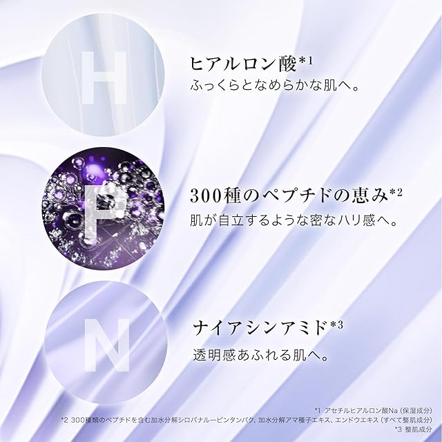 Product benefit: 300種の植物由来ペプチドの恵み*3を配合。 しなやかなテクスチャーが肌を包み込むように素早く浸透*4。 *3 300種類のペプチドを含む加水分解シロバナルーピンタンパク、加水分解アマ種子エキス、エンドウエキス(すべて整肌成分) *4 角質層まで