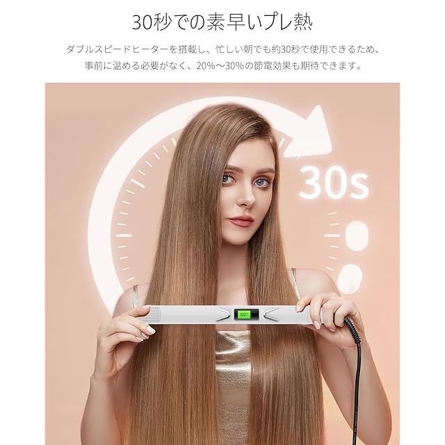 ダブルスピードヒーターを搭載し、忙しい朝でも約30秒で使用できるため、事前に温める必要がなく、20%〜30%の節電効果も期待できます。いつでも必要な時にすぐに使えるので、非常に便利です。さらに、液晶温度モニターが搭載されており、常に現在の温度を確認できるため、スタイリングプロセスの安全性と正確性を確保します。時間と電力の節約に加えて、よりプロフェッショナルなヘアスタイリング体験が楽しめます。