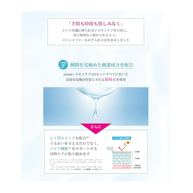 【続けられるスキンケア】雨の日も雪の日も、嬉しい日も悲しいことがあった日も、毎日欠かすことのできないスキンケア。norm+は、スキンケアをシンプルに分かりやすく、毎日無理なく続けられるよう設計しました。洗顔後に化粧水と美容液だけの基本ステップでうるおい、はり、つやのある若々しい理想的な肌へ導きます。