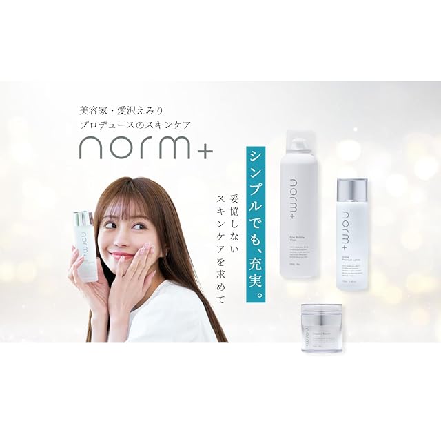 【愛沢えみりのメッセージ】スペシャルなスキンケアではなく毎日使う物だから、妥協することなく使いたい。そんな想いから生まれたスキンケアブランド、それがnorm+です。 製造をお願いしたのは長年にわたって化粧品を作り続けている化粧品メーカー。皆様の意見も参考にしつつ、毎日使えるスキンケアの開発を目指しました。スキンケアの基準を一つ上にあげるnorm+、新しい基準をぜひ体験してください。
