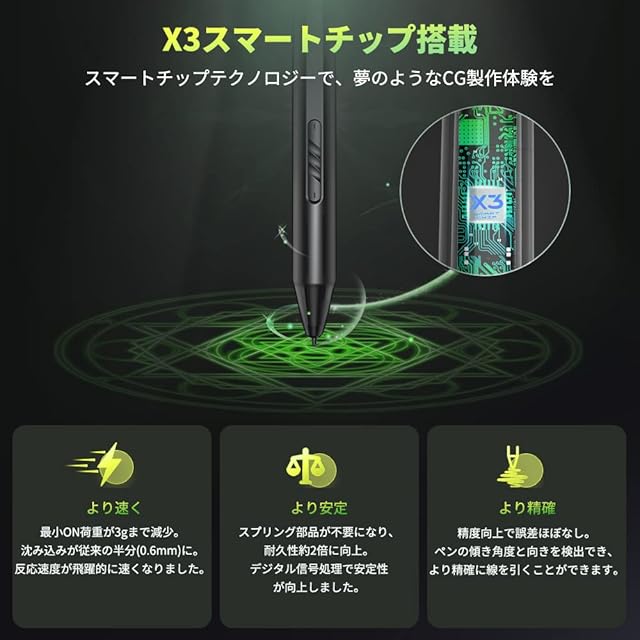 【新型X3ペン】X3チップのデジタル信号による信号伝送は劣化しにくく、安定性に優れ、高い精度の線を描けます。内部構造を一新し、ON荷重わずか3グラム、沈み込み0.6mmまで減少。耐久度は従来品の2倍を実現。また、筆圧8192レベル、傾き検知60度により、線の太さ、濃さ、流れ、全てまるで紙とペンのように思うままに描けます。