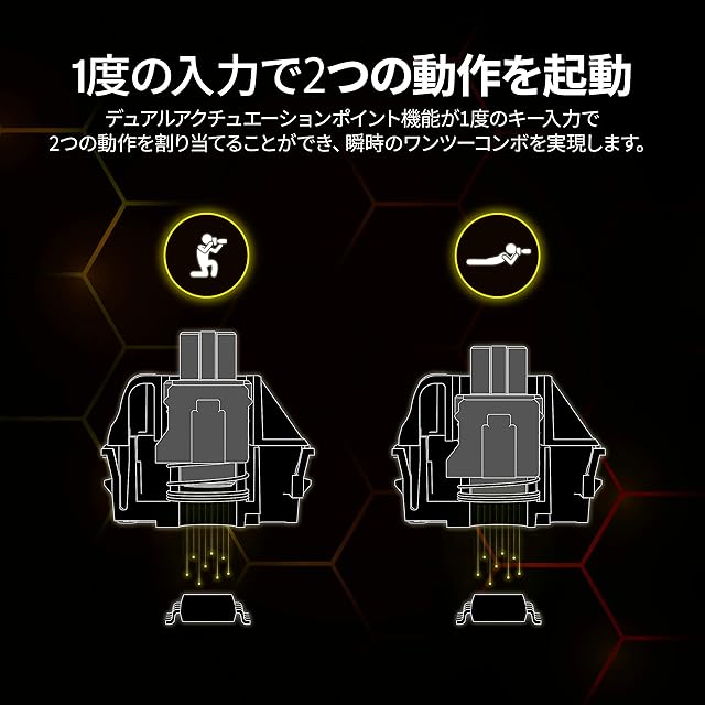 1 つのキープレスで 2 つのアクション:デュアルポイントアクチュエーションを使用すると、1 つのキープレスに 2 つの個別のアクションを割り当てることができ、瞬時にワンツーコンボを実行することができます。