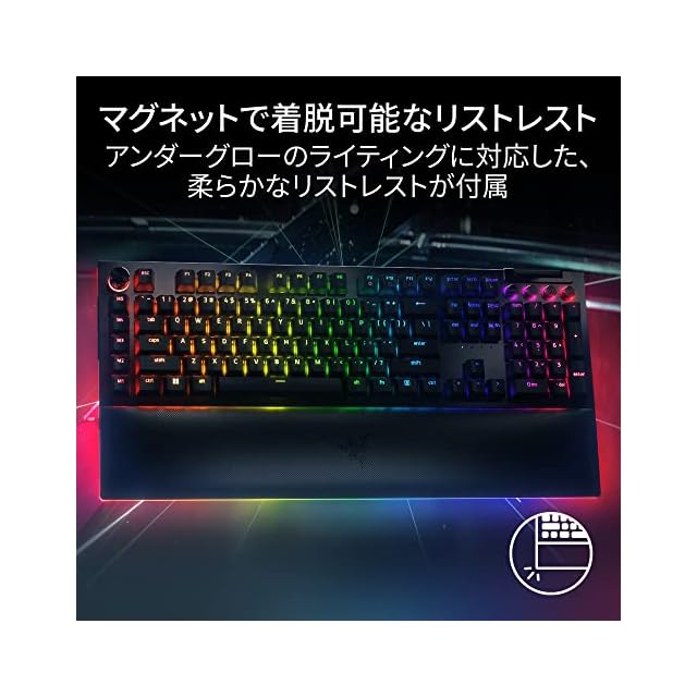 【マグネットで着脱可能なリストレスト】付属のリストレストはクッション性に優れた仕様で、長時間のゲームプレイにも適しています。また、Razer Chroma RGB にも対応しており、キーボード本体のアンダーグローと調和します。