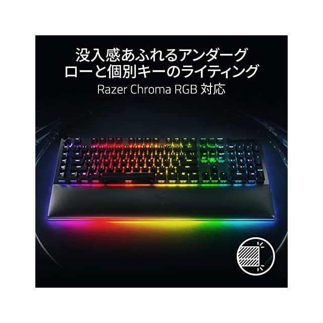【没入感あふれるアンダーグローと個別キーのライティング】各キーごとのライティングとアンダーグローのライティングを搭載。その他のRazerデバイスと同期させることにより、より深い没入感が体験できます。