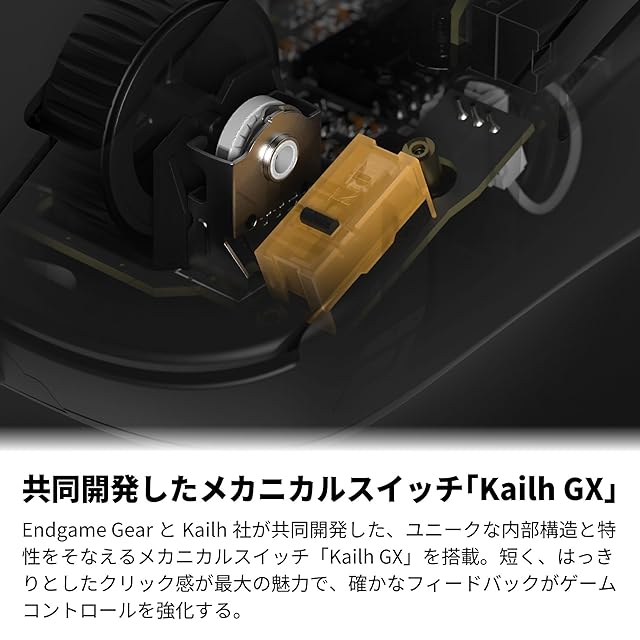 【共同開発したメカニカルスイッチ「Kailh GX」】Endgame GearとKailh社が共同開発した、ユニークな内部構造と特性をそなえるメカニカルスイッチ「Kailh GX」を搭載。短く、はっきりとしたクリック感で、確かなフィードバックがゲームコントロールを強化する。 【PixArt PAW3395センサー】類まれな精度と超高速トラッキングを実現するPixArt PAW3395センサーを搭載。~26,000 CPI、650 IPS、50Gという驚異的な性能で、マウスのあらゆる動きが正確かつ強力に。さらに、「Motion Sync」機能の活用で、手の動きとの一体感が高まりゲームプレイを最適化できる。※「Motion Sync」機能はポーリングレート4000Hzまで対応。