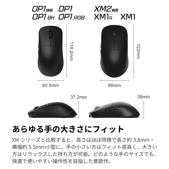 つかみ持ちに特化した設計 : これまでのXMシェイプの理念を取り入れつつ、つかみ持ちに特化した全く新しいデザイン。側面は逆ハの字ではなくフラットな形状で、指の場所が固定されず自由な持ち方が可能。また、メインボタンの側面までシェルを延長しているため、誤クリックの心配なく右端に指を置きやすい。 【あらゆる手の大きさにフィット】XMシリーズと比較すると、高さはほぼ同様で長さ約3.8mm・横幅約5.5mm小型に。手の小さい方はフィット感高く、大きい方はリラックスした持ち方が可能。