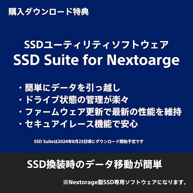 ご購入特典のSSD Suiteでデータ引越サポート、SSDの健康状態、ファームウェア更新が可能。