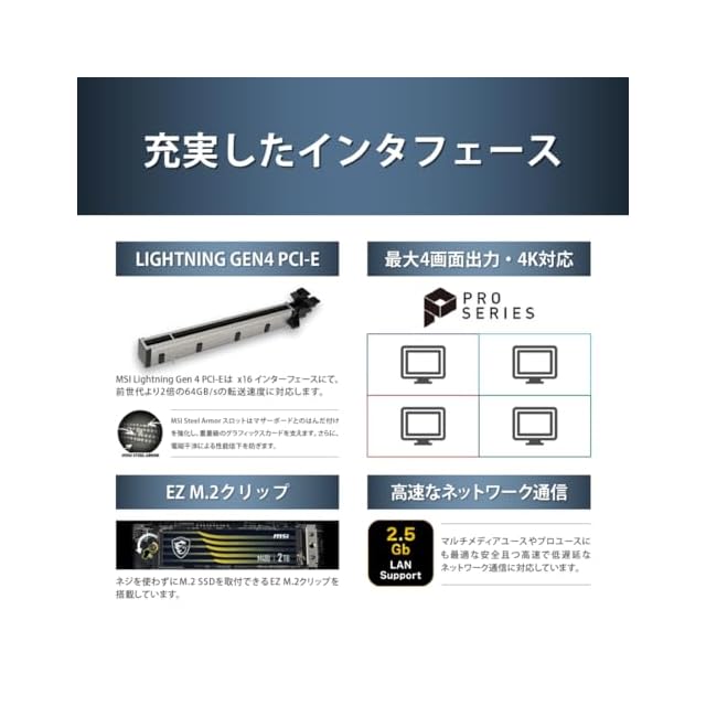 PCIe Gen4x4対応のM.2ポートを2基搭載、ストレージへの高速アクセスが可能です。EZ M.2 clipにより、脱着も簡単に行うことができます。