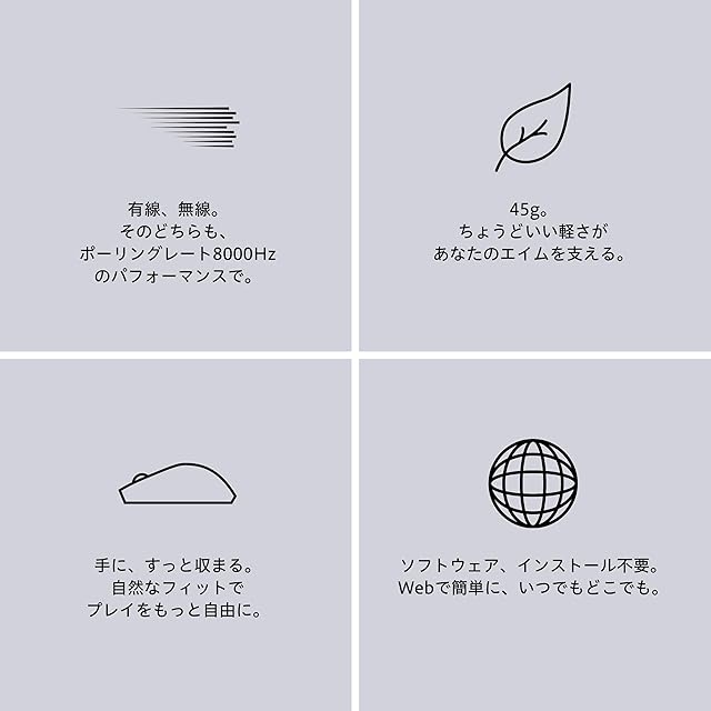 【美しさを研ぎ澄ます、志向のスペック】わずか45gの超軽量設計と8,000Hzの高速レスポンスが、まるでマウスと手が一体化したような操作感を生み出す。センサーにはPAW3395を採用し、1秒間に8,000回のデータ更新で、わずかなブレも正確に反映。