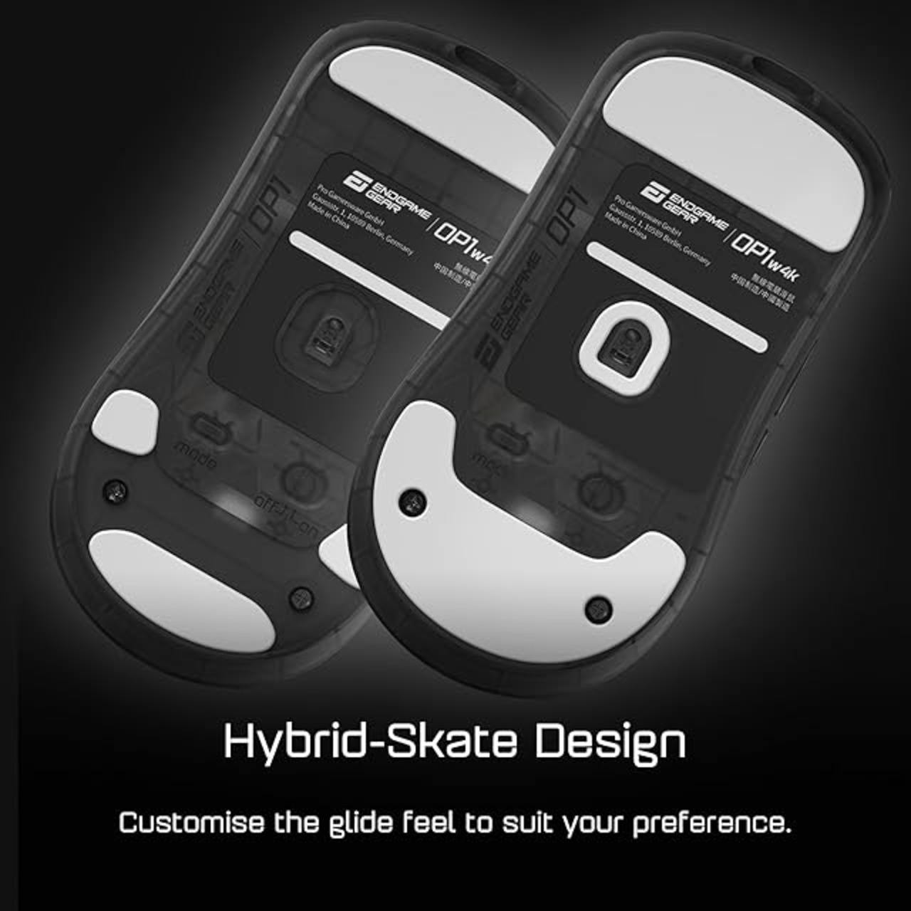 自由度の高いマウススケート:スケート用の溝を幅広く取り、使用するマウスパッドや好みの滑りに合わせて柔軟に選べるよう設計。ドットタイプ等のスケートも、貼る場所を自由に決められる。デフォルトでは面積・重量・滑走性のバランスが取れた小スケートを装着し、柔らかいマウスパッド用に大スケートも同梱。