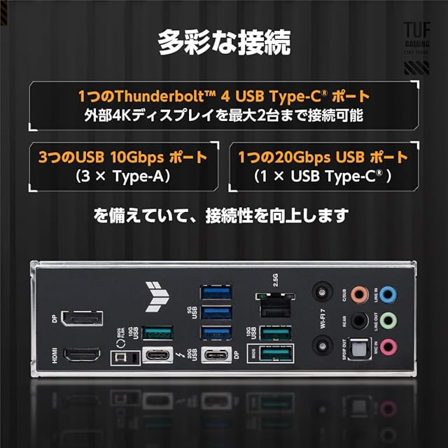 幅広い接続性:次世代GPU対応のPCIe 5.0 x16スロット、Thunderbolt 4 USB Type-Cポート、フロントパネルUSB 20Gbps Type-Cポート、Thunderbolt (USB4)ヘッダー対応