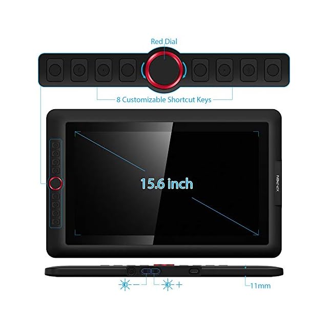 【特別デザイン--ファンクションキー】Artist15.6 Proは本体の左側に8つのファンクションキーを搭載、加えてダイヤルを回して調整できるラジアルキーが搭載。現時点で液タブ本体に回転させて調整できるラジアルキーを搭載しているのはこの機種だけ。