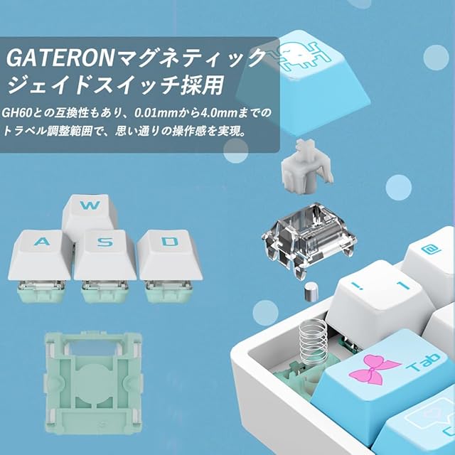 ラピッドトリガー 0.01mm対応 デッドゾーン無し レイアウトUS配列 サイズ60% スイッチKS-20T Jade switch ホットスワップ対応 バックライト搭載 キーキャップPBT OEM キーキャップ フレームプラスチック ソフトウェアHEMU Driver(日本語対応) ポーリングレート 8000hz
