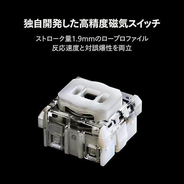 【独自開発のオリジナル磁気スイッチ搭載】トッププロと幾度となく試作を繰り返し、たどり着いた反応速度と対誤爆性を両立するストローク量1.9mmのロープロファイル磁気スイッチを搭載しております。耐久回数として、1億回以上を誇ります。